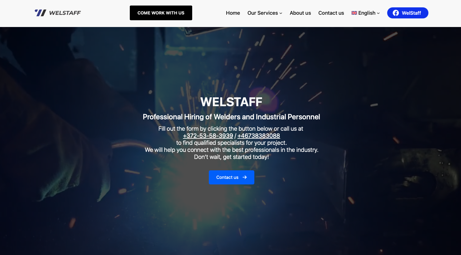 WelStaff is a specialized recruitment agency providing certified welders and industrial personnel for large-scale construction projects across Scandinavia. The website was designed to bridge the gap between heavy industry contractors and highly skilled labor, emphasizing reliability and technical certification.
